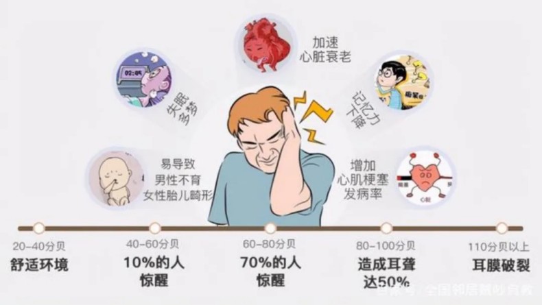 曾有數據顯示,城市的噪音每上升一分貝,高血壓發病率就增加3%。在70分貝到90分貝的噪音中待5年,人患高血壓的危險性高2.47倍。