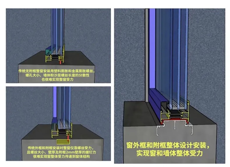 獨特的下坎凸框設計使得舊框能夠嵌入式地與附框緊密結合,進而與墻體基層形成一體化結構,有效阻斷水分滲透。