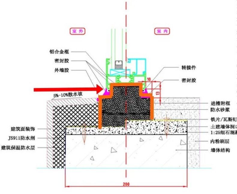 微膨脹快速水泥砂漿灌輸到附框內部四周,把附框與建筑結構固定在一起,從而也起到了防水的作用,同時保證窗體的穩固性。